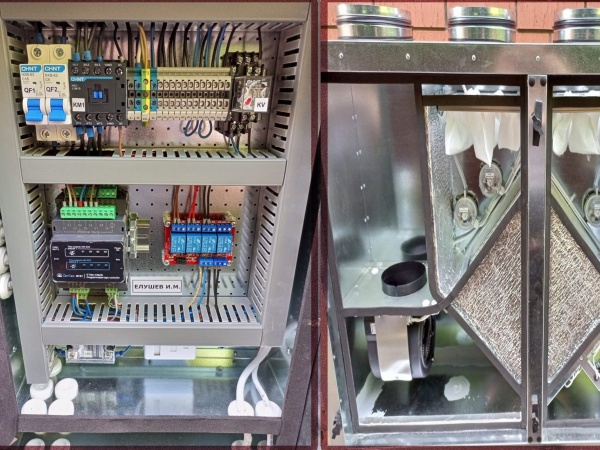 Набор оборудования позволяет выполнять одновременно вентилирование, осушение, нагрев воздуха в холодное время года или охлаждение его летом.